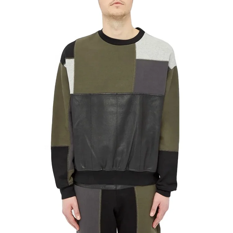Home » Products » Sweatshirt » Custom Crewneck Color Block Patchwork Leather Sweatshirt For Men