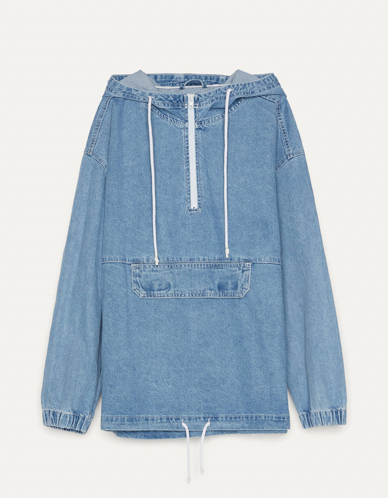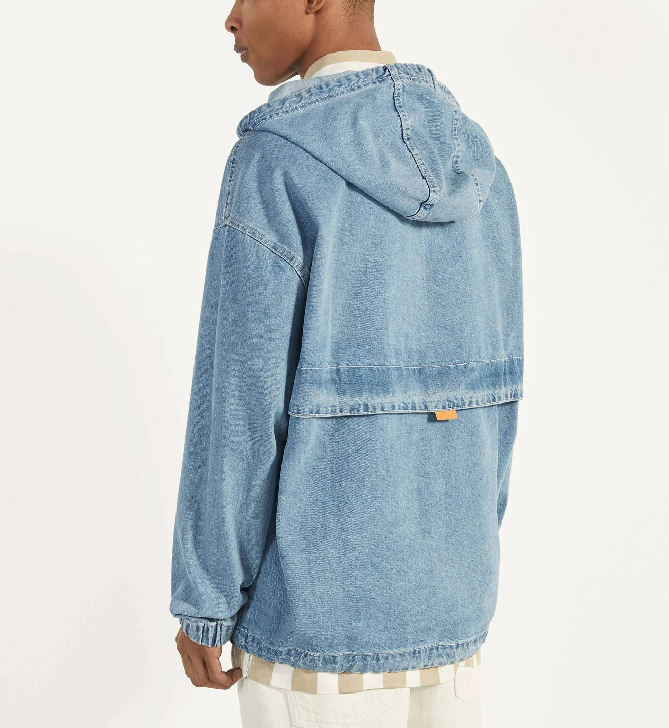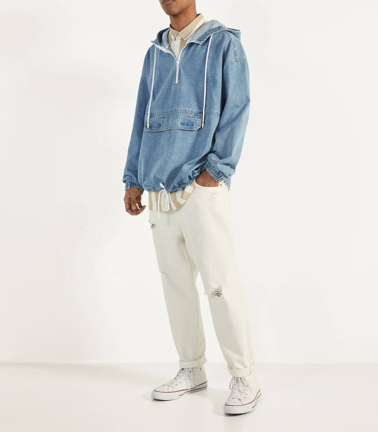 Home » Products » Hoodie » Custom Light Blue Denim Pouch Pocket Oversized Pullover Jacket Men Hoodie