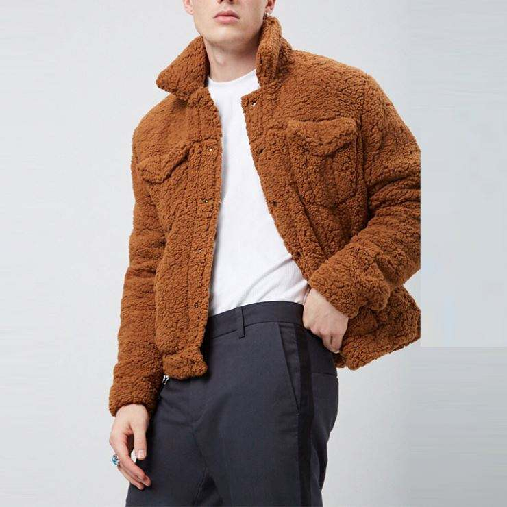 Home » Products » Jacket » Custom Logo Design Hot Sale Mens High Quality Decorated Snap-Button Khaki Faux Shearling Jacket