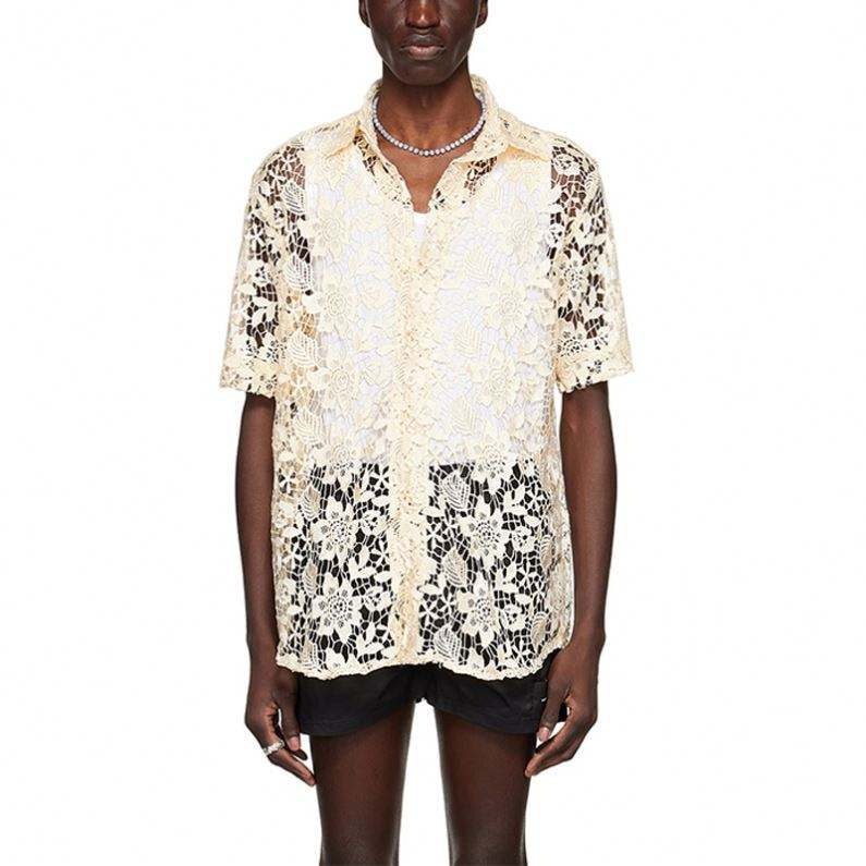 Home » Products » Shirt » OEM Manufacturer Custom Men Fashion Beige Yellow High Quality Square Collar Short Sleeve Button Hollow Out Lace Shirt