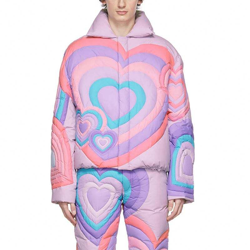 Home » Products » Jacket » Oem Manufacturer Custom Winter Long Sleeve Puffer Concealed Zip Heart Pattern Design Purple Down Jacket
